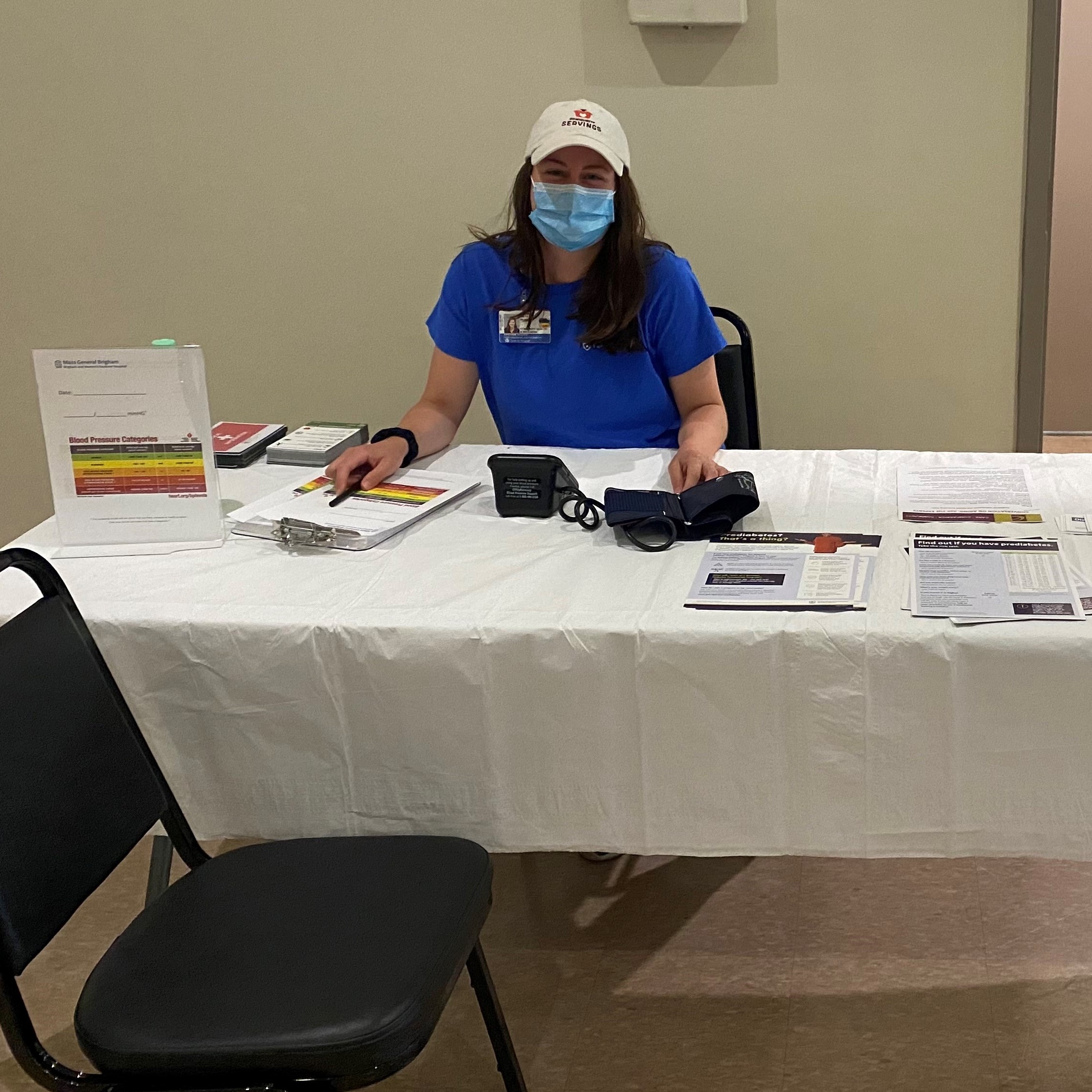 Community Health Program Manager Katie Plante offers blood pressure screenings at Ethos’ Conversation on Aging: Ask the Experts event in West Roxbury