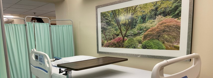 When a patient is moved from the ED to a temporary hallway bed on an inpatient unit, they are transferred to the care of their inpatient nurse. In the temporary hallway space, the nurse has everything needed to care for that patient and the patient has what they need to be comfortable, including a bedside table and call bell.