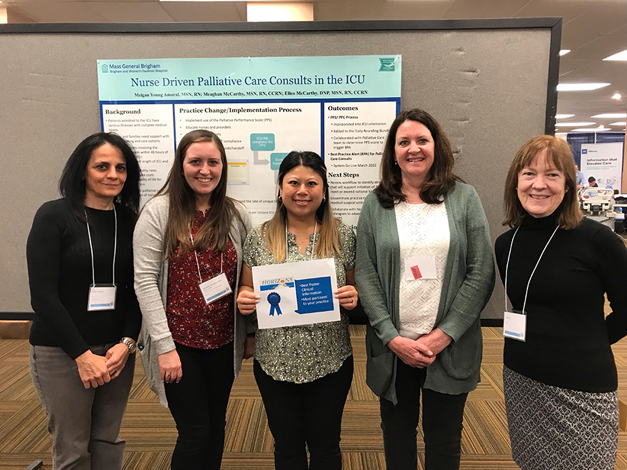 At the event, the ICU’s Meigan Young Amaral, MSN, RN, along with Clinical Leader Ellen McCarthy, DNP, MSN, RN, CCRN, and staff nurse Meaghan McCarthy, MSN, RN, CCRN, presented their poster presentation, “Nurse Driven Palliative Care Consults in the ICU.” The Unit Based Council project was started here at BWFH to improve the rate of palliative care consults for patients in the ICU, which in turn brings much needed resources to the patients, their families and the staff in the ICU. At the end of the Horizons Conference, the team was awarded the Best Poster for Clinical Information Most Pertinent to Your Practice.