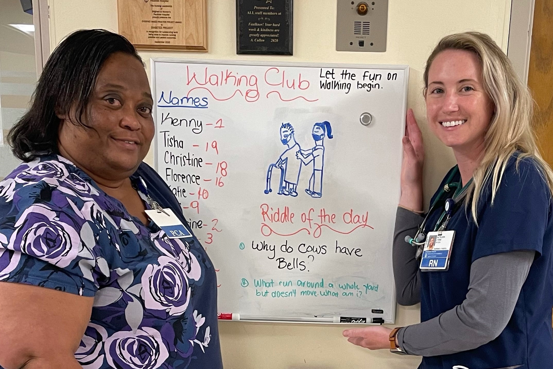 “I’m not quite sure who originally came up with the idea, but soon Tisha started keeping track of each of our coworkers’ walks with patients on a whiteboard and it quickly became a friendly competition amongst the staff. Our manager even offered a free beverage coupon for the first person to complete 30 walks,” explains Lyons.