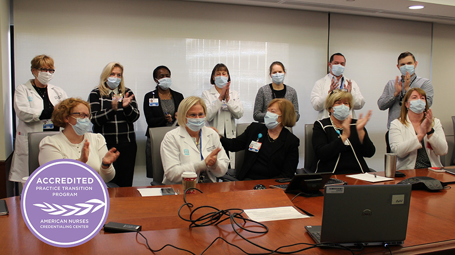 In order to earn ANCC PTAP designation, the Department of Nursing needed to meet ANCC evidence-based criteria to demonstrate the program’s excellence in transitioning nurses to new practice settings. “It was a big job. We had to complete a formal gap analysis and submit a comprehensive self-study that required 38 written narratives with supporting documentation demonstrating how our program meets established criteria. We then had a virtual site visit by the ANCC PTAP accreditation team,” says Professional Development Program Manager for Nursing Orientation and Transition to Practice Jennifer Capone, MSN, RN, who led the department’s efforts. “I am so thankful for the support from my colleagues who helped make this happen.”