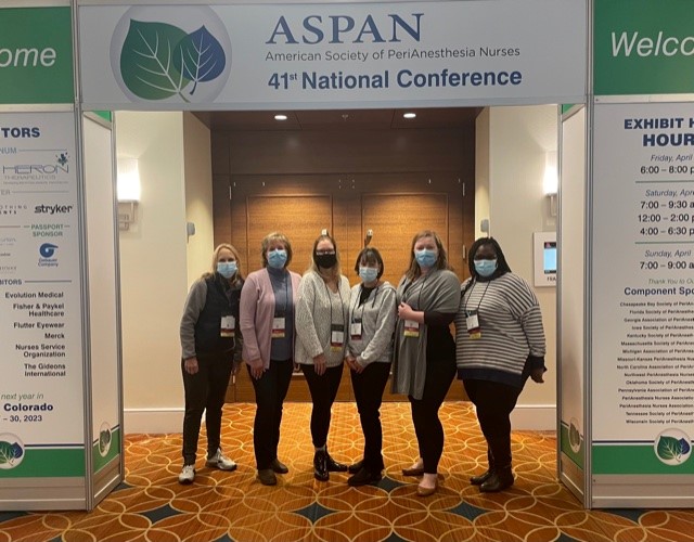 Among those who attended were Professional Development Manager Kathy McCarraher, MHA, BSN, RN, CPAN, ONC, PACU Clinical Leader June Nichols, BSN, RN, Preoperative Holding Permanent Charge Nurse Carolyn Geoghegan, RN, CAPA, Perianesthesia Flow/Operations Manager Pam Park, MSN, RN, FNP-C, Chief Nurse Practitioner for the Center for Preoperative Evaluation Nickisha Hurlock, MSN, RN, FNP-C, and Associate Chief Nurse, Perianesthesia/Procedural and Ambulatory Services Robin Kaufman, DNP, APRN, FNP-C, NEA-BC. PACU Clinical Leader Charlene Salvi, BSN, RN, CPAN, presented virtually.