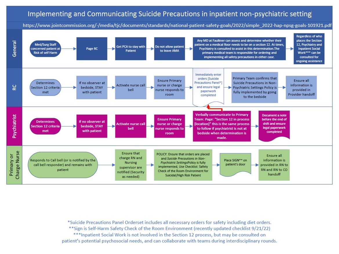 Upon recognizing the issue, Uhl-Israel assembled a multidisciplinary team of experts in risk management, patient safety and clinical care for a Collaborative Case Review. The result is a new process map designed to guide staff, step-by-step, through the process of implementing and communicating suicide precautions in inpatient non-psychiatric settings.