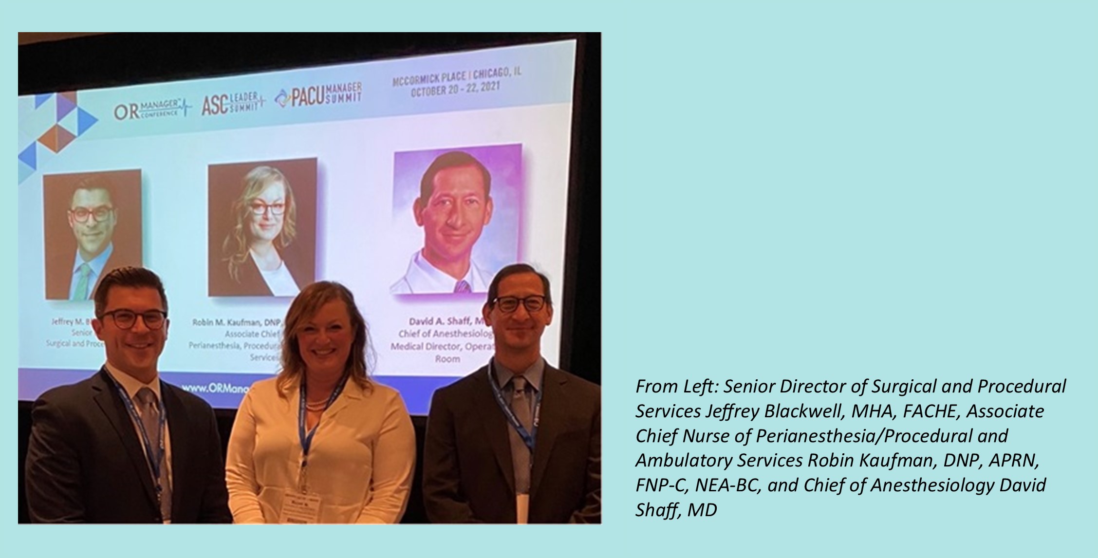 The session, titled “50 Ways to Leave from Phase II: A Team Approach to Same Day Discharge,” featured BWFH’s Chief of Anesthesiology David Shaff, MD, Associate Chief Nurse of Perianesthesia, Procedural and Ambulatory Services Robin Kaufman, DNP, APRN, FNP-C, NEA-BC, and Senior Director of Surgical and Procedural Services Jeffrey Blackwell, MHA, FACHE. During the presentation, the group discussed the growing demand for same-day joint replacement, as well as surgical oncology, and outlined the steps needed to institute a successful program, including adopting best practices, thoughtful patient selection, electronic health record optimization and cohesive patient education developed by a multidisciplinary team.