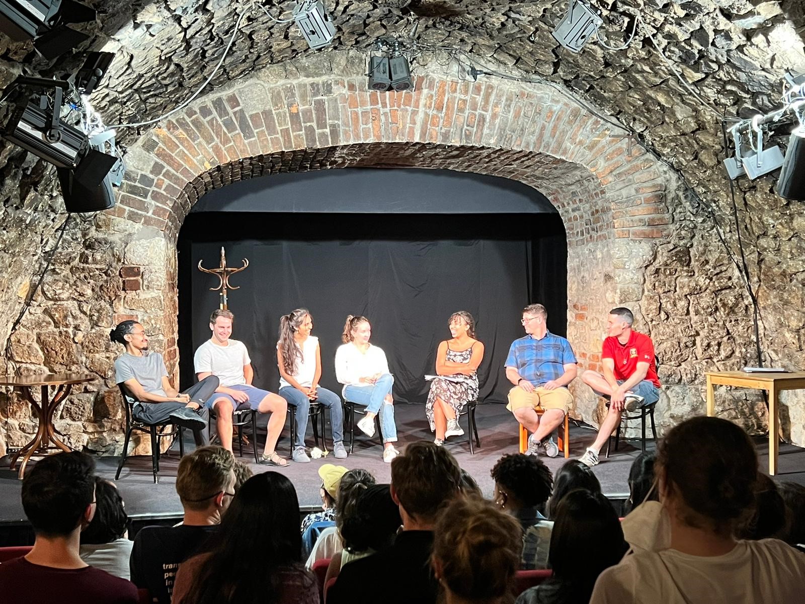 Deonauth (third from left) participates in a reading of the play “Queen” by Madhuri Shekar in a small theater in Poland