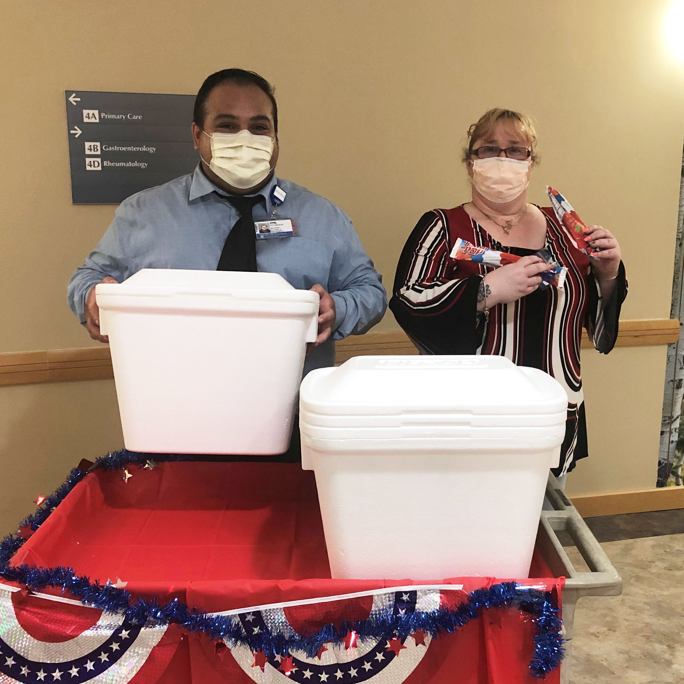 Transport Department Supervisor Kathleen Clancy and Manager of Materials Management Jorge Villanueva give out popsicles in honor of the Fourth of July holiday