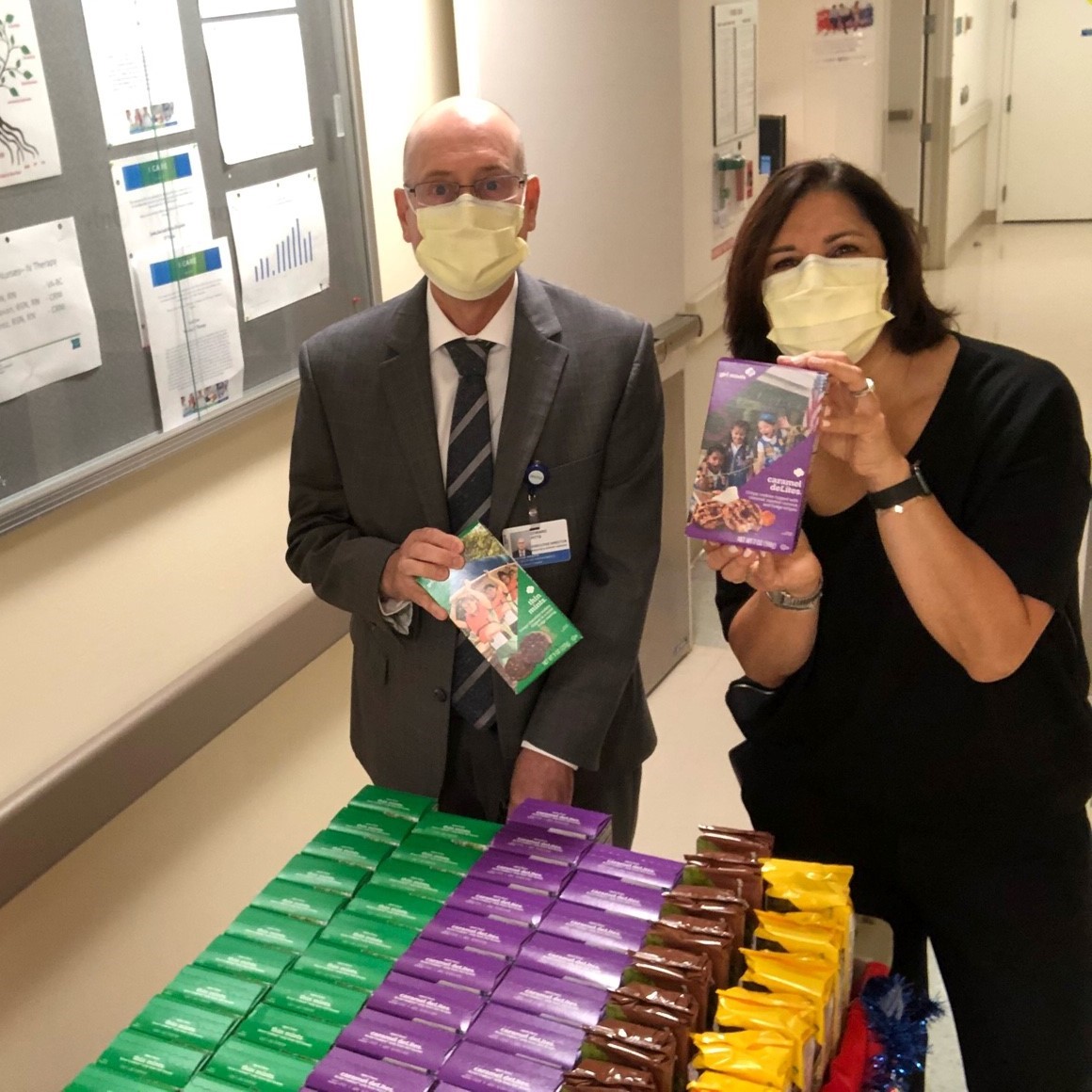 Executive Director of Human Resources Laura Barnett and Executive Director of Facilities and Support Services Ed Pitts deliver Girl Scout cookies in the wee hours of the morning