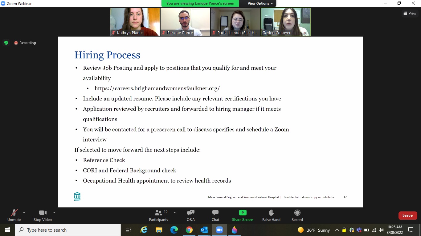 As staffing challenges continue to impact hospitals across the United States, Brigham and Women’s Faulkner Hospital has committed to recruiting and training individuals from within our community who want to work in the hospital, caring for the members of our community who come to us for their healthcare. To achieve this goal, the hospital recently collaborated with Jamaica Plain Neighborhood Development Corp. (JPNDC) to host a virtual job fair.