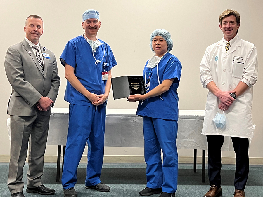 At a special presentation hosted by Chief of Radiology Dylan C. Kwait, MD, and Director of Radiology Brian McIntosh, BS, RT(R) CRA, Interventional Radiology Supervisor Jeff Elwood presented Zhang with her award.